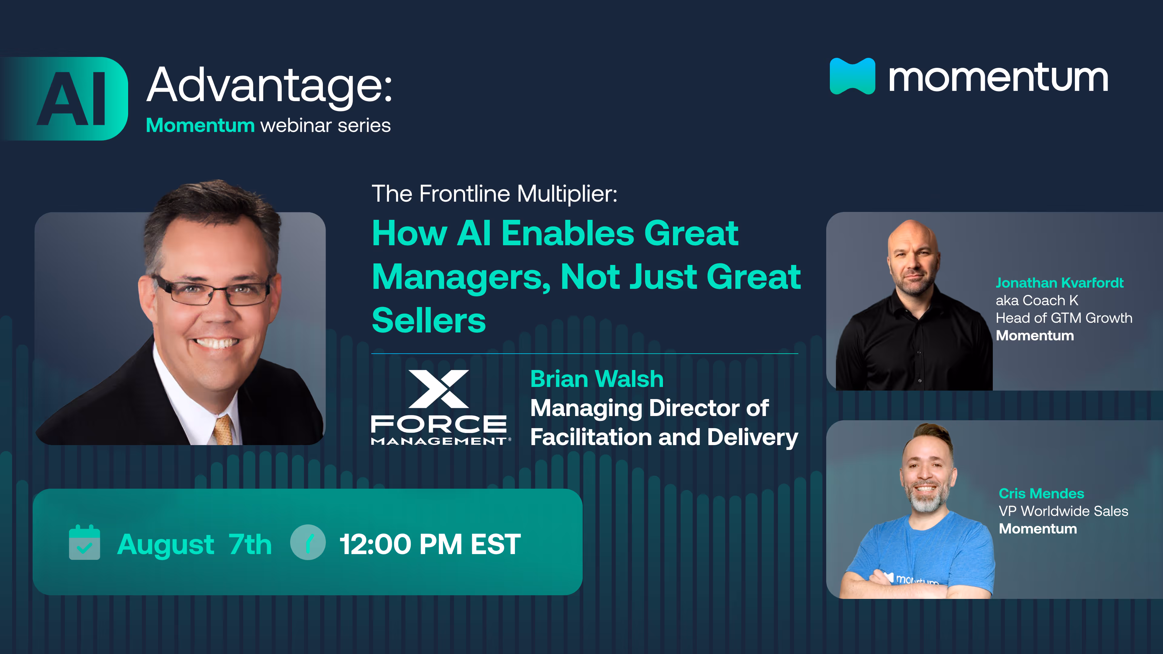 That was the sharp, unfiltered message behind our recent AI Advantage webinar, “The Frontline Multiplier: How AI Enables Great Managers, Not Just Great Sellers,” featuring Brian Walsh, Managing Director of Facilitation and Delivery at Force Management. Hosted by Momentum’s own Jonathan Kvarfordt (aka Coach K, Head of GTM Growth) and Cristiano Mendes (VP of Sales), this session was a reset on how sales leaders need to think about AI’s role in their orgs.