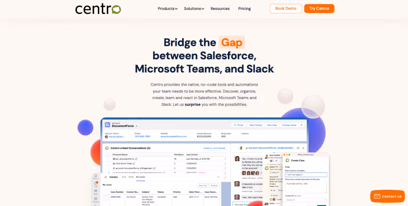Centro offers a flexible toolkit for integrating Salesforce and Slack, often utilized for "case swarming" and complex handoff scenarios. It is distinct in its ability to embed Slack conversations directly onto Salesforce record pages.