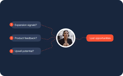 - Misses signals: silent churn risk, reduced usage, unhappy champions.