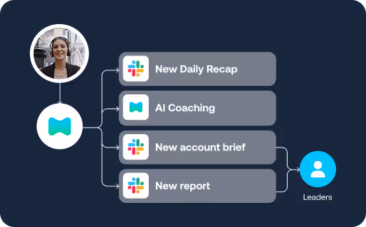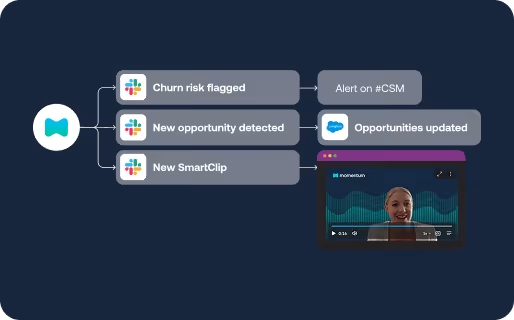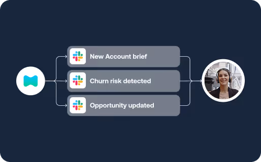 - Slack alerts: “Churn risk flagged: champion not present,” “Expansion opportunity detected.”